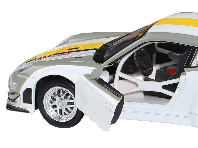 Модель выполнена в масштабе 1:32, у нее открываются двери. Яркий спортивный дизайн, спойлер, обтекаемая форма кузова придают суперкару стремительный внешний вид. Колеса с резиновыми покрышками и литыми дисками, детально проработанный салон, фары, прозрачные окна, выхлопные трубы - всё как у настоящего автомобиля.
