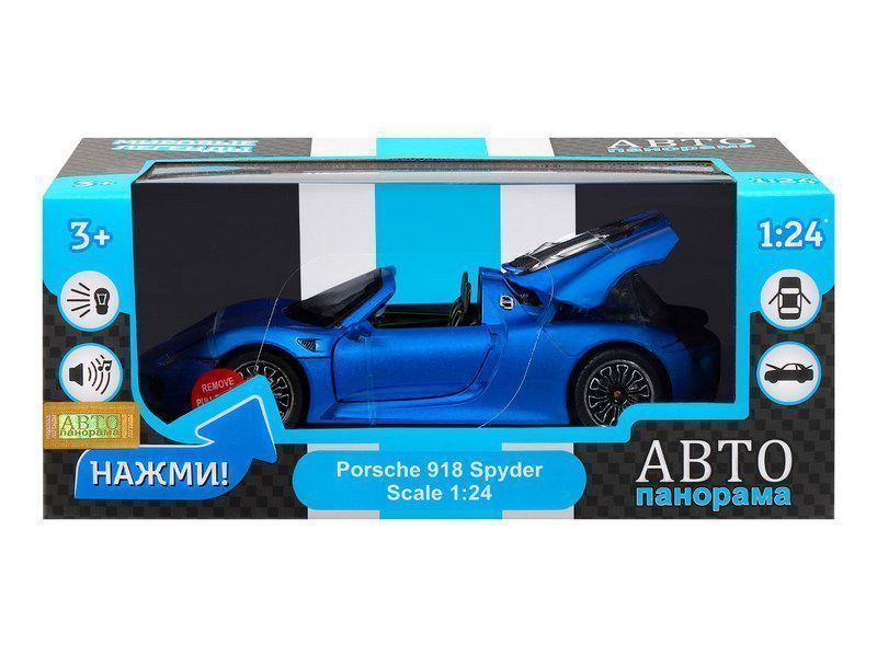 Машина "АВТОПАНОРАМА" Porsche 918 Spyder, 1/24, синий, свет, звук, в/к 24,5х12,5х10,5 см