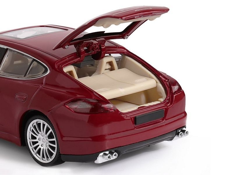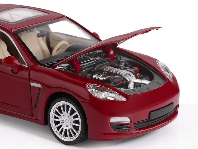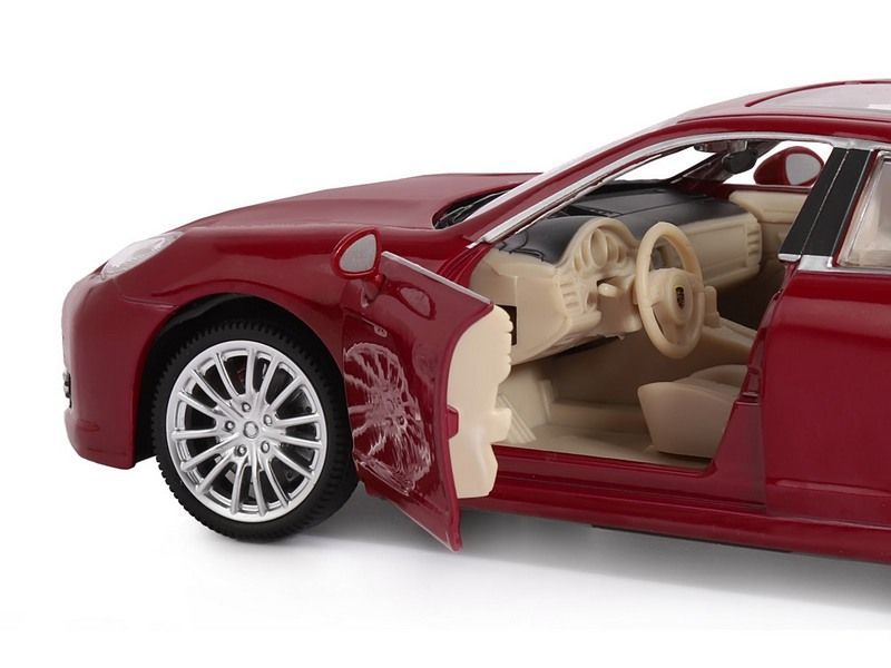 Модель выполнена в масштабе 1:24, у нее открываются передние двери, капот и багажник. Свободный ход колес позволяет катать игрушку практически по любой поверхности. Колеса машинки с резиновыми покрышками, их можно покрутить с помощью руля.