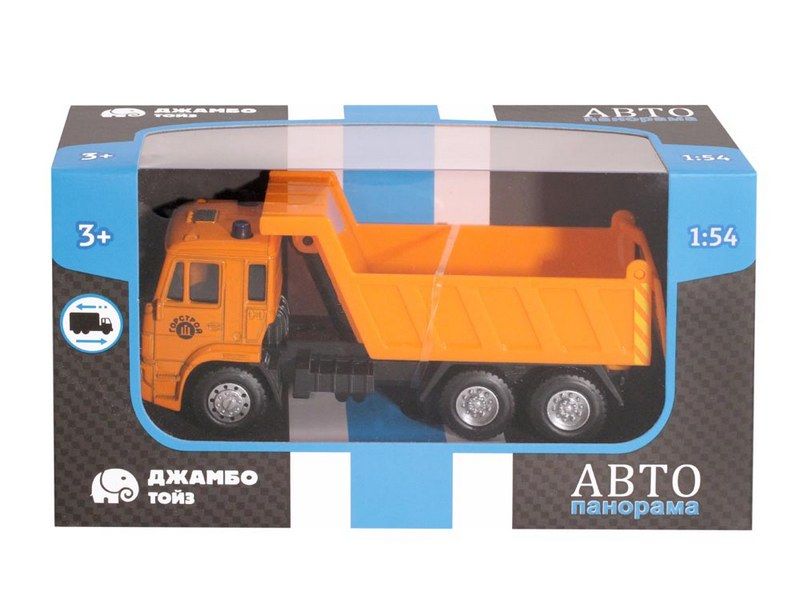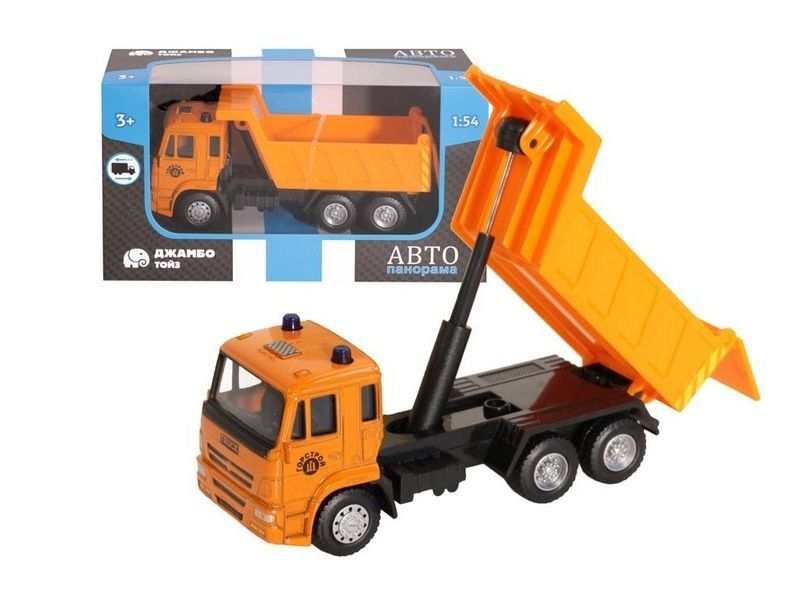 Модель "Самосвала" выполнена в виде металлического грузовика оранжевого цвета. Похожие машины иногда встречаются на улицах города или в музеях транспорта. Модель выполнена в масштабе 1:54, у нее поднимается кузов.