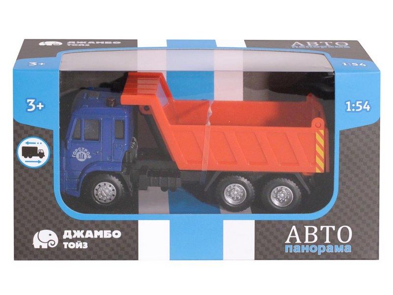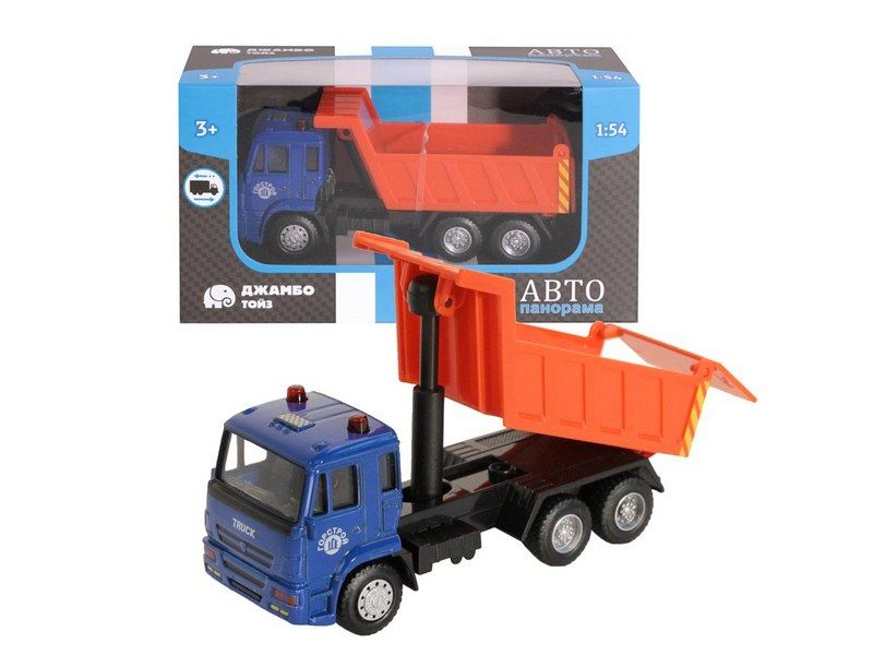 Модель "Самосвала" выполнена в виде металлического грузовика оранжевого цвета. Похожие машины иногда встречаются на улицах города или в музеях транспорта. Модель выполнена в масштабе 1:54, у нее поднимается кузов.