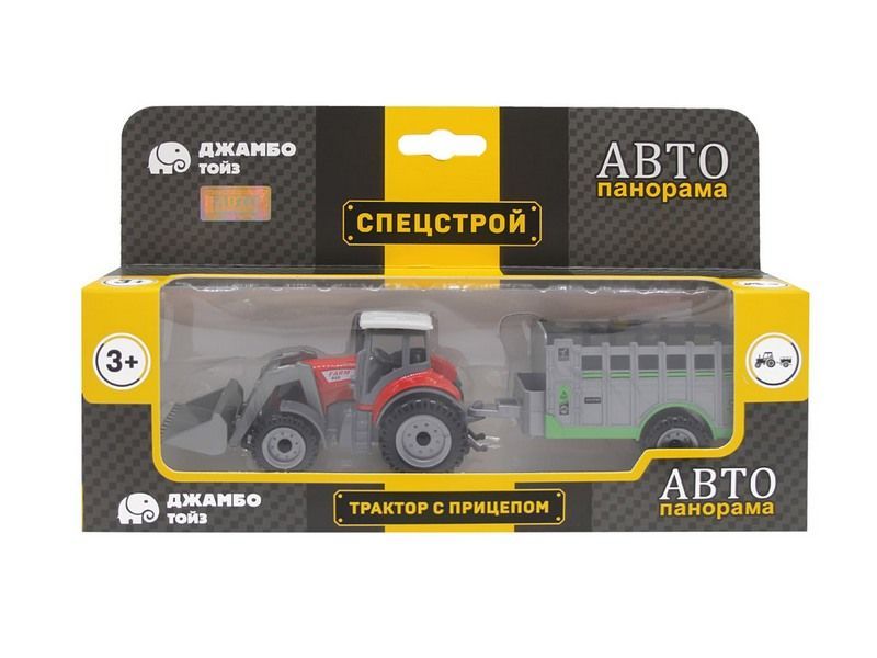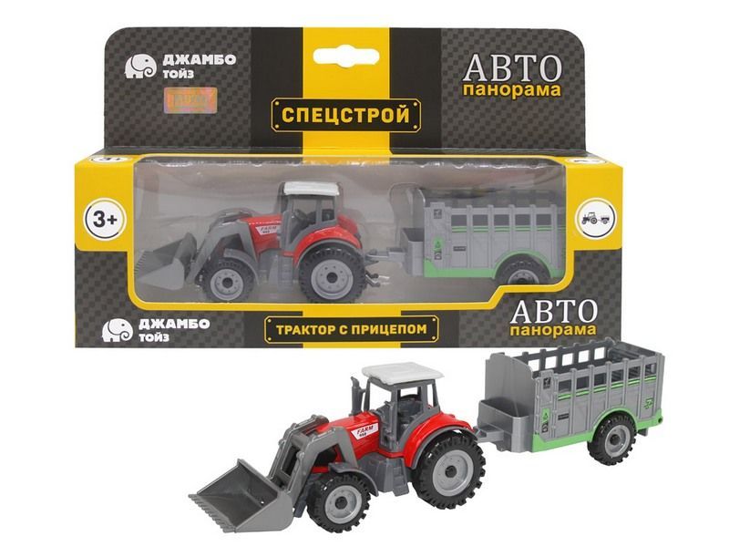 Машина "АВТОПАНОРАМА" ТРАКТОР-ПОГРУЗЧИК С ПРИЦЕПОМ, красный, в/к 27,5*5,5*9,5 см