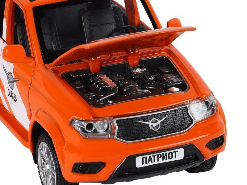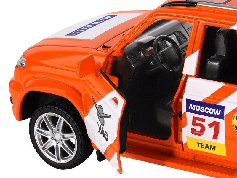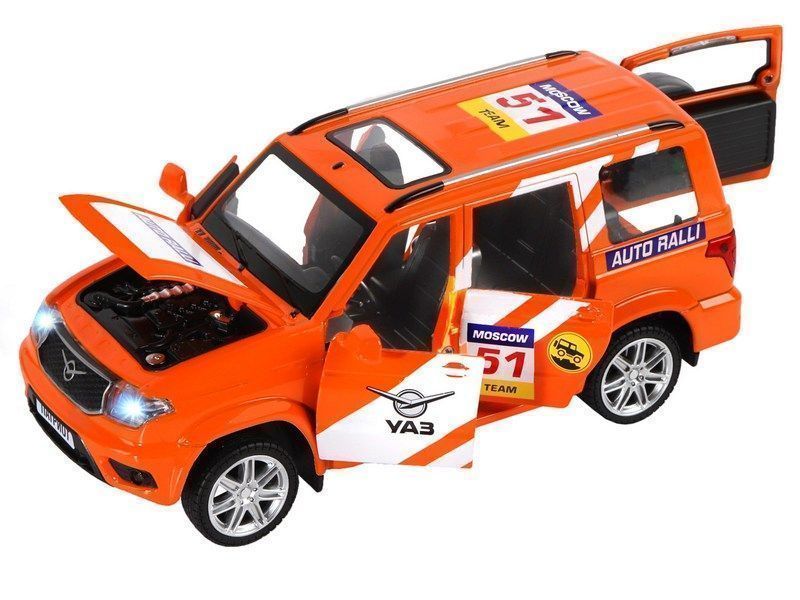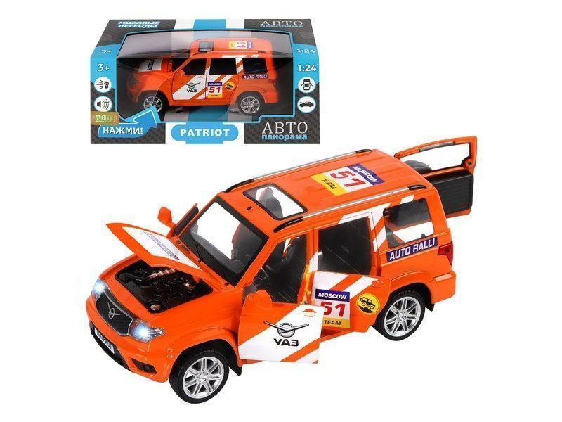 Металлическая лицензионная машинка УАЗ "PATRIOT" RALLY - уменьшенная копия настоящего автомобиля, рестайлинговая модель 2019 года. Машинка прекрасно дополнит игрушечный автопарк и сделает игру более увлекательной, полной невероятных приключений.