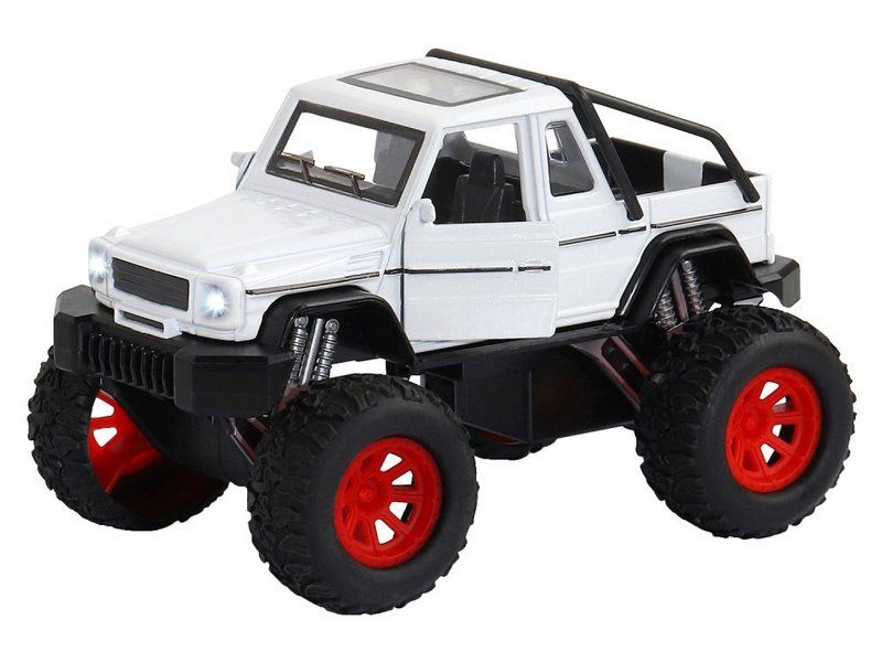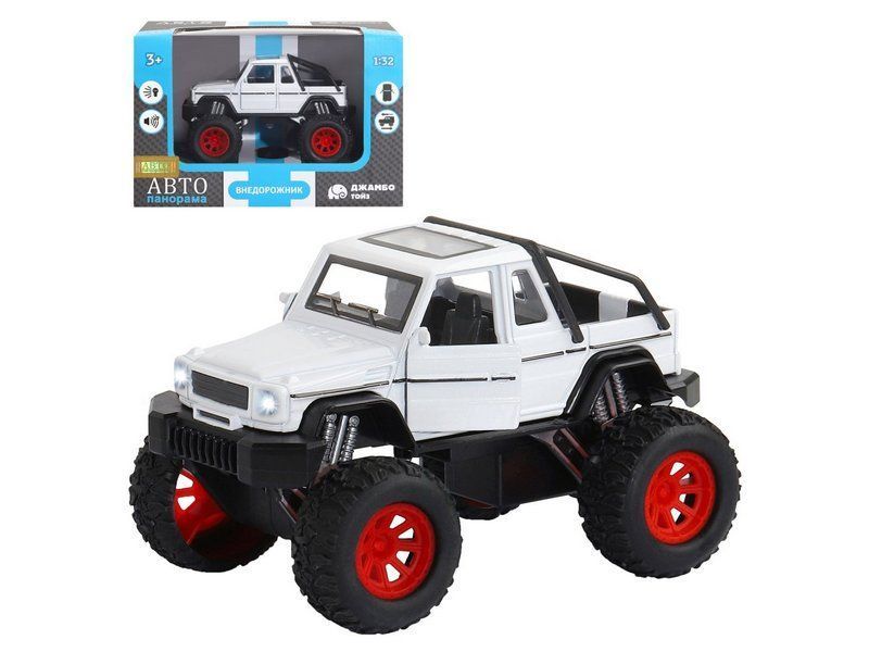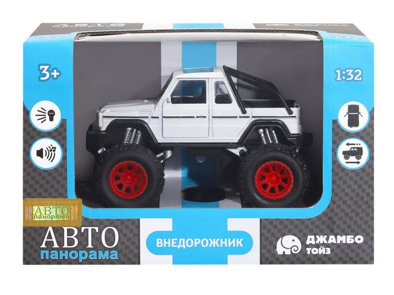 Модель выполнена в масштабе 1:32. Передние двери открываются, в кабину можно посадить игрушечного водителя, а в багажник погрузить небольшие предметы, придумывая новые игровые сюжеты. Благодаря независимой пружинной подвеске, машинку можно катать практически по любой поверхности, преодолевая сложные препятствия. Мощные колеса с резиновыми покрышками и рельефным рисунком, дворники на лобовом стекле, детально проработанный салон, люк в крыше, фары, усиленные бамперы - всё как у настоящего джипа.