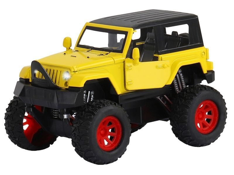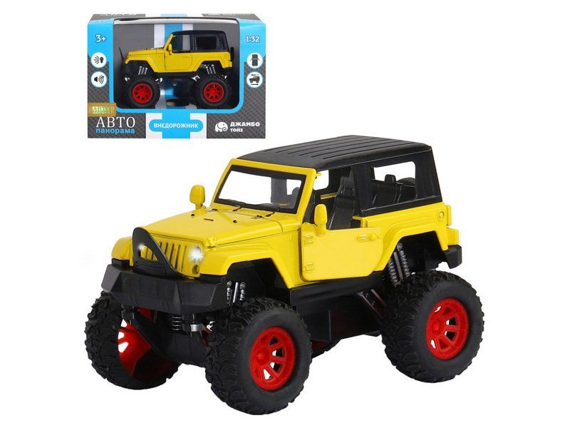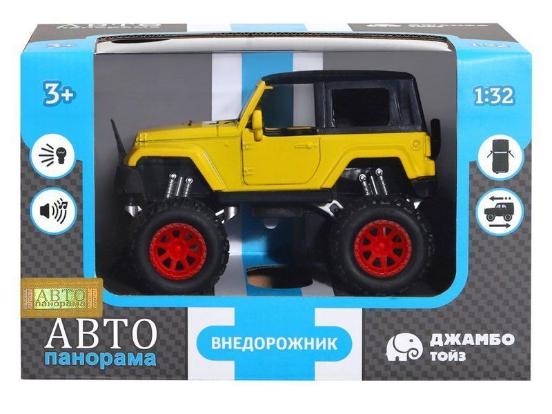 Модель выполнена в масштабе 1:32. Передние двери открываются, в кабину можно посадить игрушечного водителя, а в багажник погрузить небольшие предметы, придумывая новые игровые сюжеты. Благодаря независимой пружинной подвеске, машинку можно катать практически по любой поверхности, преодолевая сложные препятствия. Мощные колеса с резиновыми покрышками и рельефным рисунком, дворники на лобовом стекле, детально проработанный салон, люк в крыше, фары, усиленные бамперы - всё как у настоящего джипа.