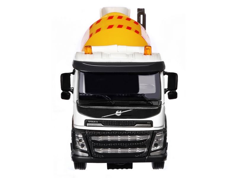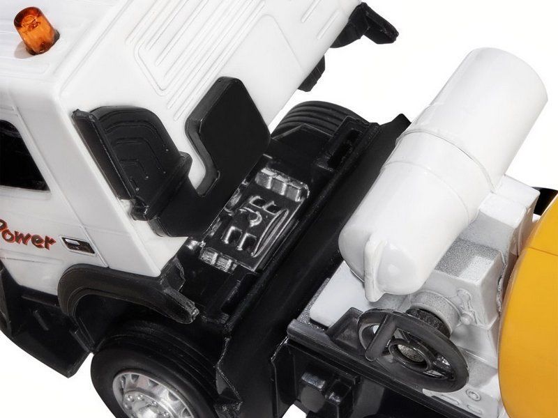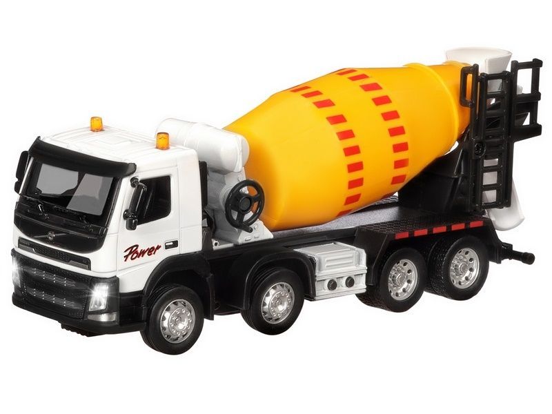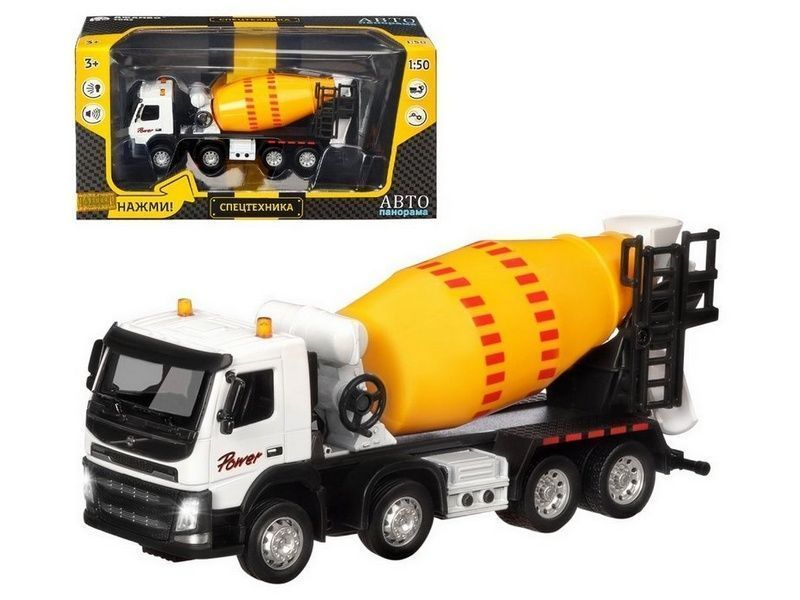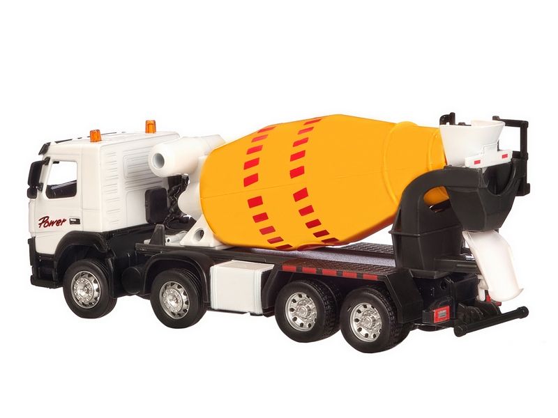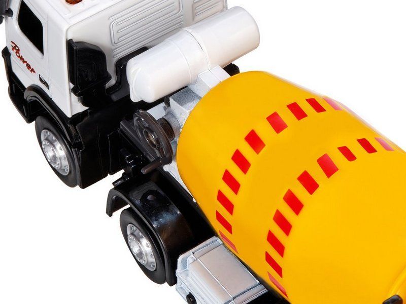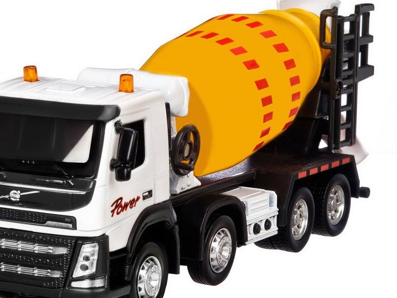 Модель выполнена в масштабе 1:50, имеет подвижные элементы, у нее откидывается кабина, крутится в разные стороны барабан, как у настоящей техники. Сзади расположена лестница и поворачивающийся желоб для раствора. Свободный ход колес позволяет катать игрушку практически по любой поверхности. Если нажать на корпус, загорятся фары, мигалки и включится звук мотора.