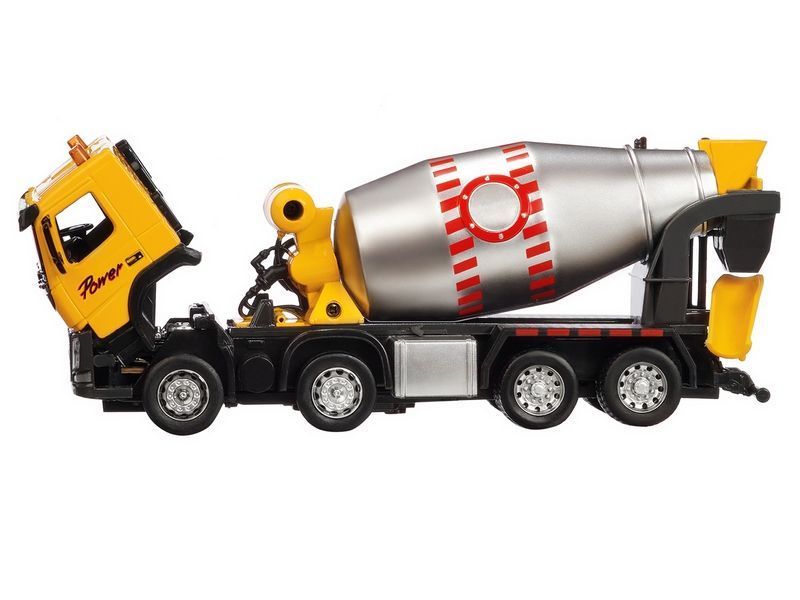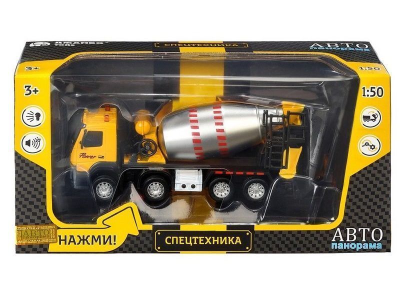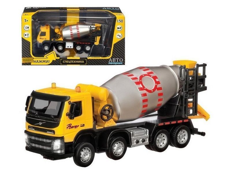 Машина "АВТОПАНОРАМА" Volvo бетономешалка, желтый, 1/50, свет, звук, в/к 28*14*10 см