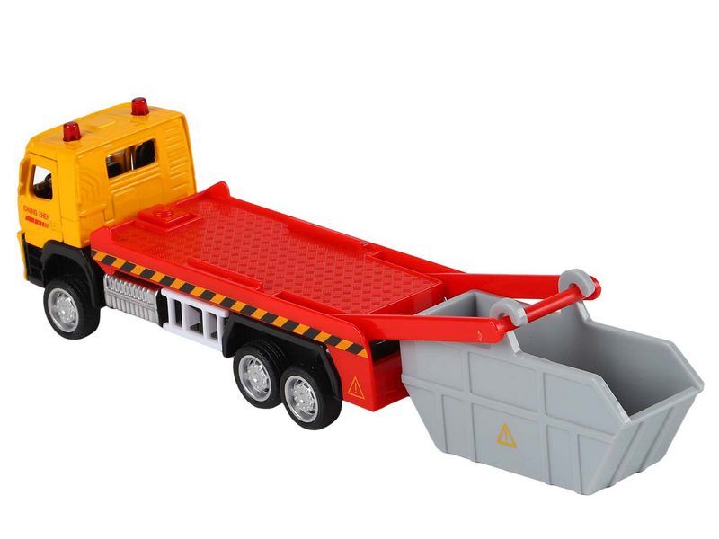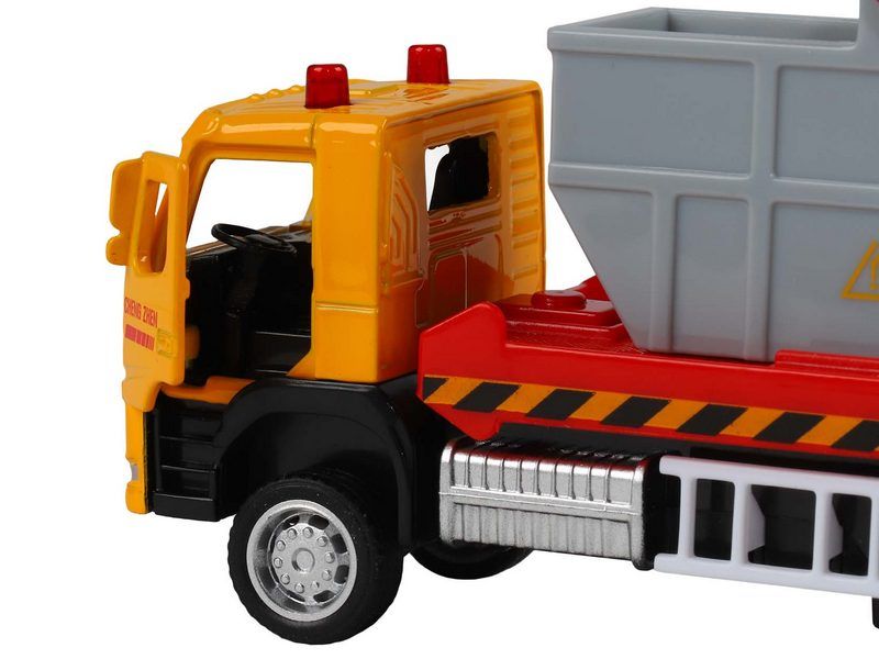 Модель выполнена в масштабе 1:72, хорошо детализирована, имеет крепкий корпус, у нее открываются двери в кабине и есть подвижные элементы. Колеса с резиновыми покрышками, прозрачные окна, наклейки на корпусе, "мигалки", большой мусорный контейнер - всё как у настоящего автомобиля.