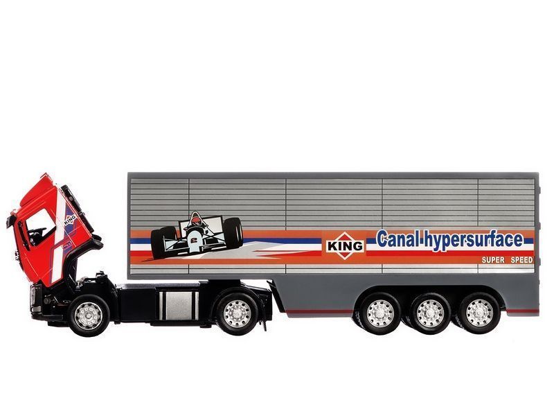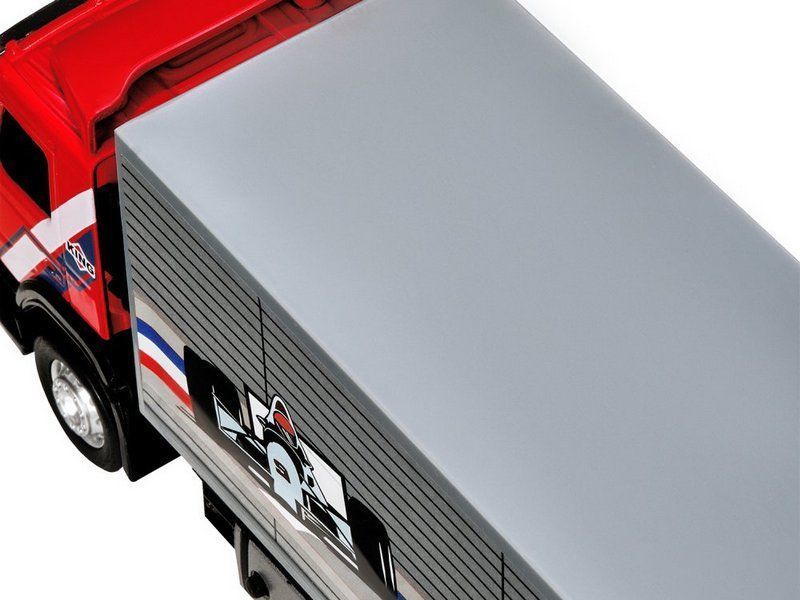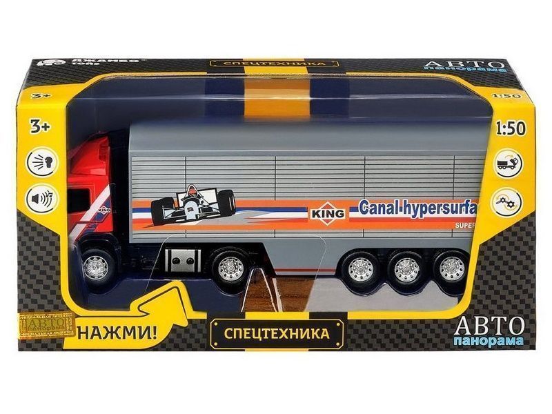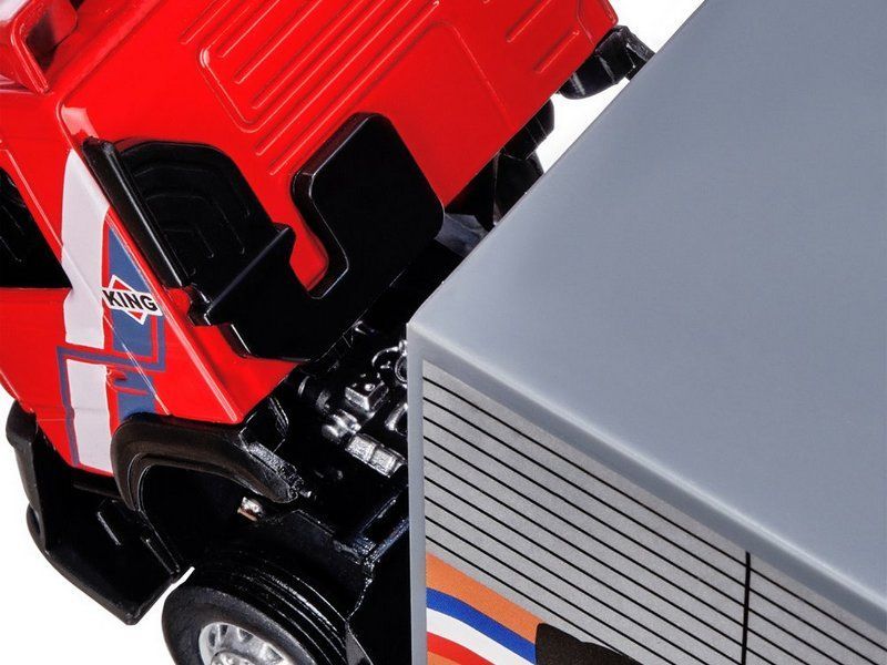 Модель выполнена в масштабе 1:50, имеет подвижные элементы, у нее откидывается кабина, как у настоящей техники. Свободный ход колес позволяет катать игрушку практически по любой поверхности. Если нажать на корпус, загорятся фары, мигалки и включится звук мотора.