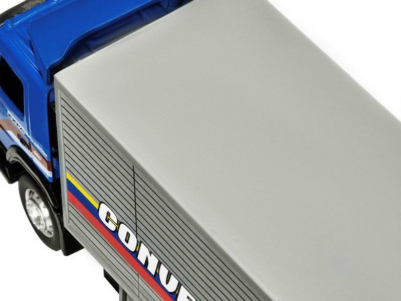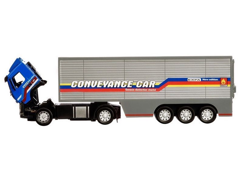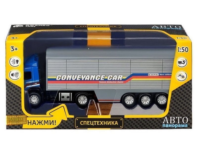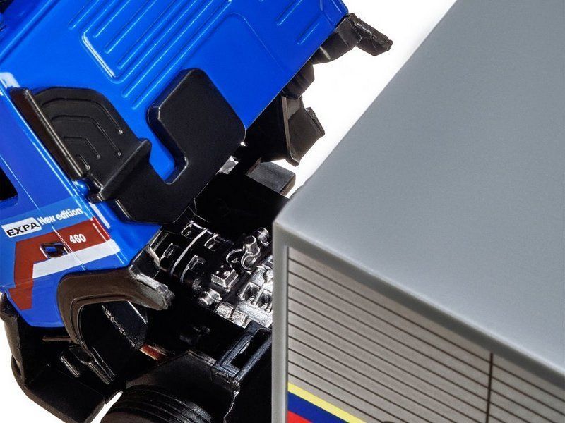 Модель выполнена в масштабе 1:50, имеет подвижные элементы, у нее откидывается кабина, как у настоящей техники. Свободный ход колес позволяет катать игрушку практически по любой поверхности. Если нажать на корпус, загорятся фары, мигалки и включится звук мотора.