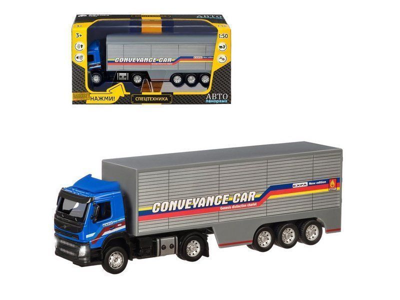 Машина "АВТОПАНОРАМА" Volvo, синий, 1/50, свет, звук, в/к 28*14*10 см