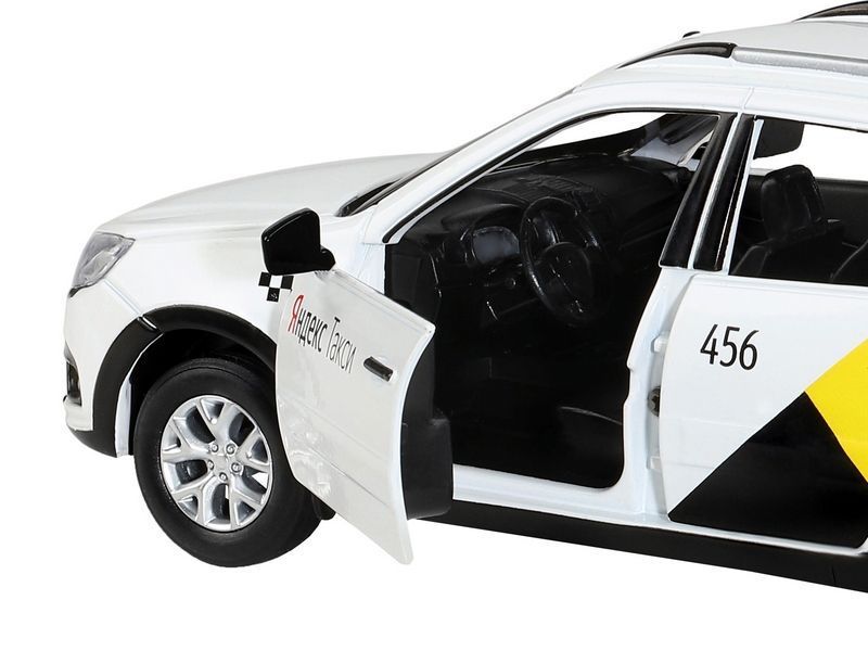 Модель выполнена в масштабе 1:24, у нее открываются передние и задние двери, капот и багажник. Колеса с резиновыми покрышками, зеркала, дворники, фирменная раскраска Яндекс.Такси с шашечками и индивидуальным номером - всё как у настоящего автомобиля.