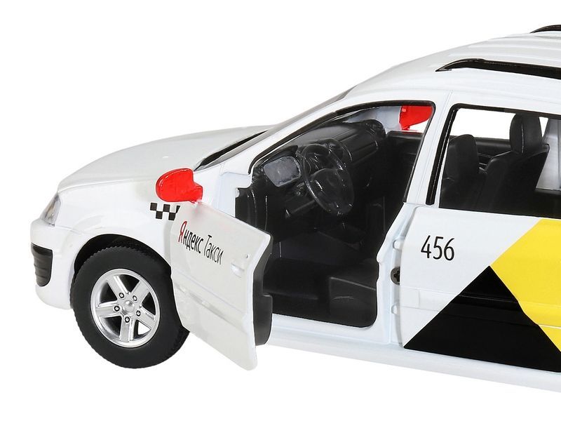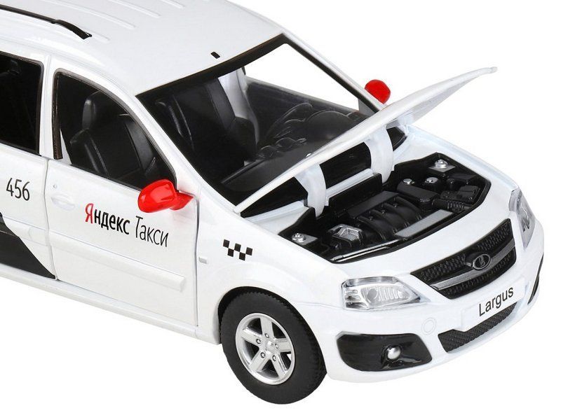 Модель выполнена в масштабе 1:24, у нее открываются передние и задние двери, капот и багажник. Колеса с резиновыми покрышками, зеркала, дворники, фирменная раскраска Яндекс.Такси с шашечками и индивидуальным номером - всё как у настоящего автомобиля.