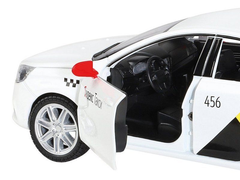 Модель выполнена в масштабе 1:24, у нее открываются передние и задние двери, капот и багажник. Игрушка оснащена инерционным механизмом - если откатить автомобиль немного назад и отпустить, он поедет вперед. Колеса с резиновыми покрышками, зеркала, дворники, фирменная раскраска Яндекс.Такси с шашечками и индивидуальным номером - всё как у настоящего автомобиля.