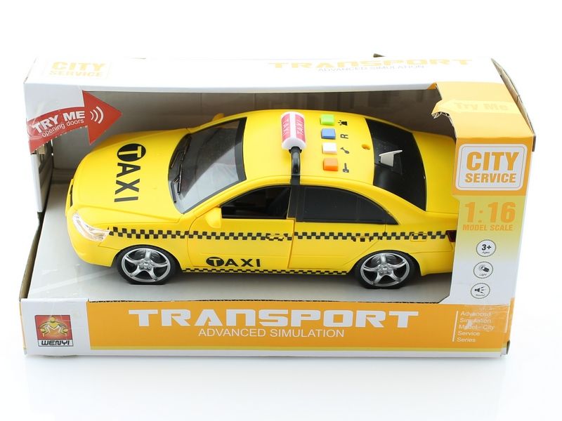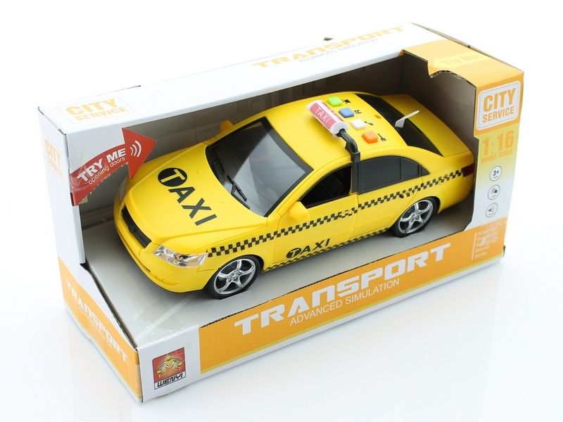 Инерционная машинка Такси в масштабе 1/16. Машинка для тех, кто готов доставлять пассажиров по любому маршруту. Двери машинки открываются, что позволяет рассмотреть салон изнутри в де…
