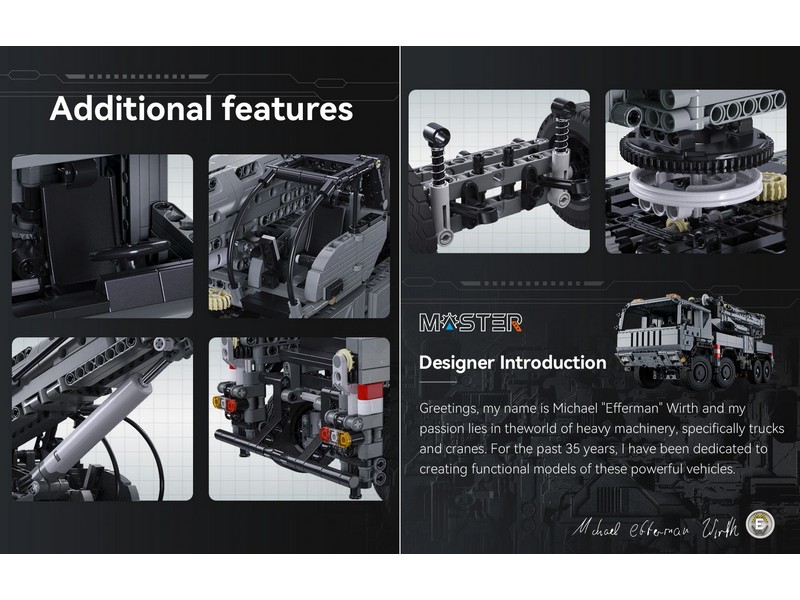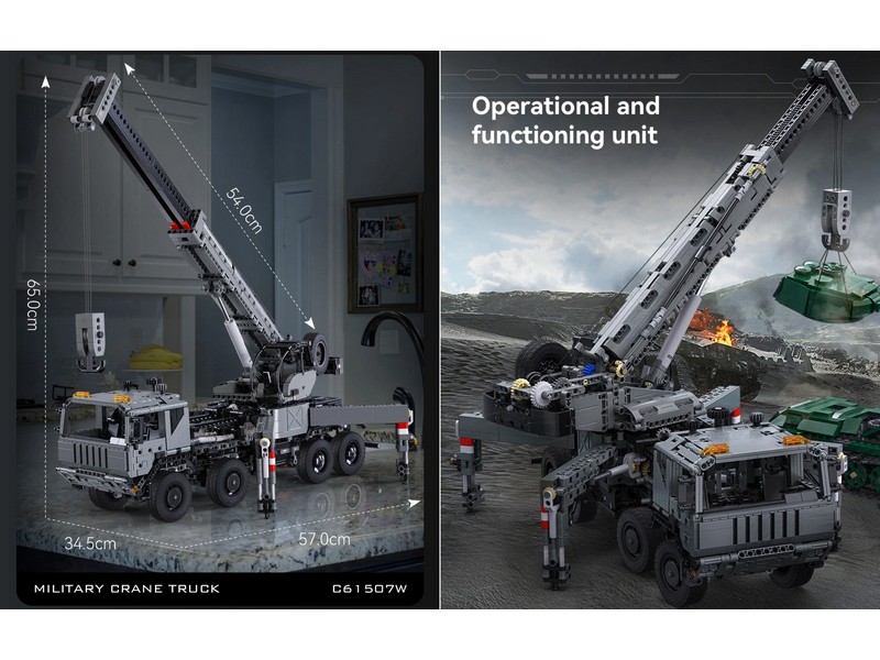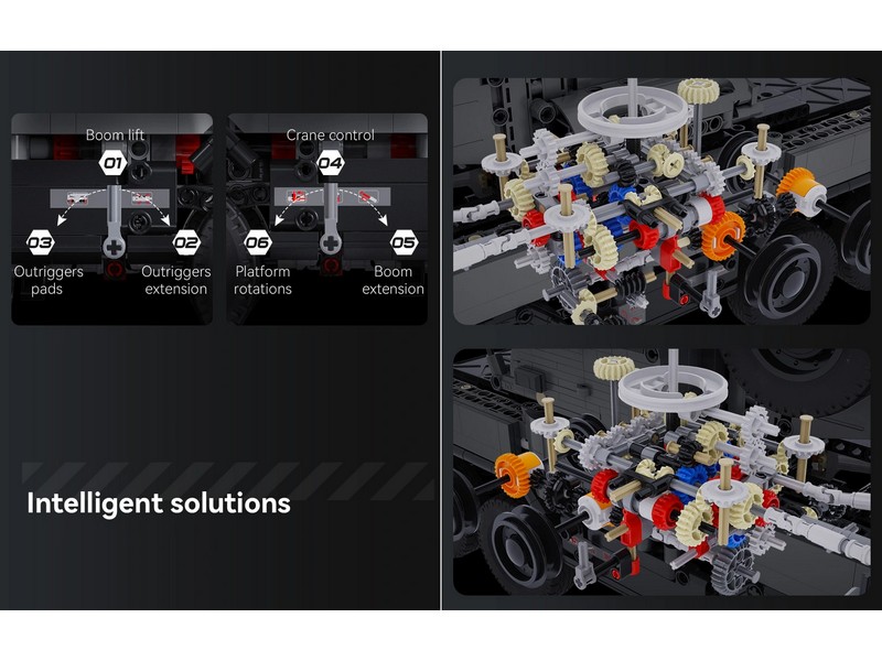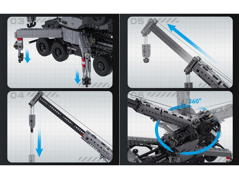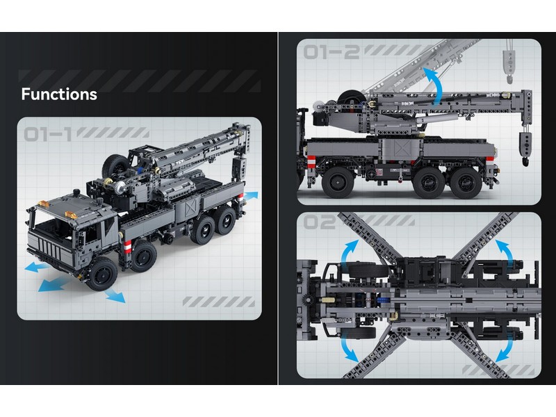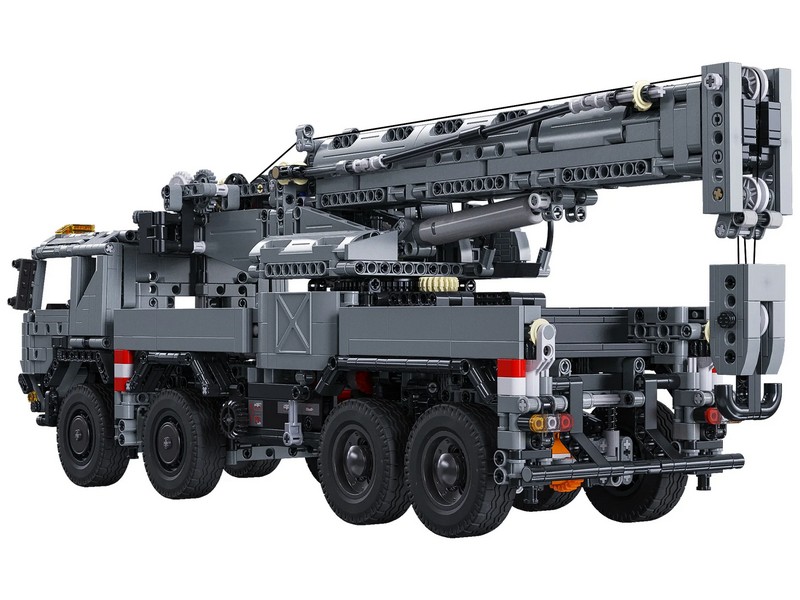 Этот набор позволит из 2686 деталей построить тщательно проработанную модель автомобиля, которая впечатляет своими функциональными возможностями и реалистичностью. Крановая установка обладает подвижной стрелой, которая может подниматься и опускаться до 54 см, достигая высоты до 65 см, а также вращаться на 360 градусов, позволяя воспроизвести различные рабочие процессы.
