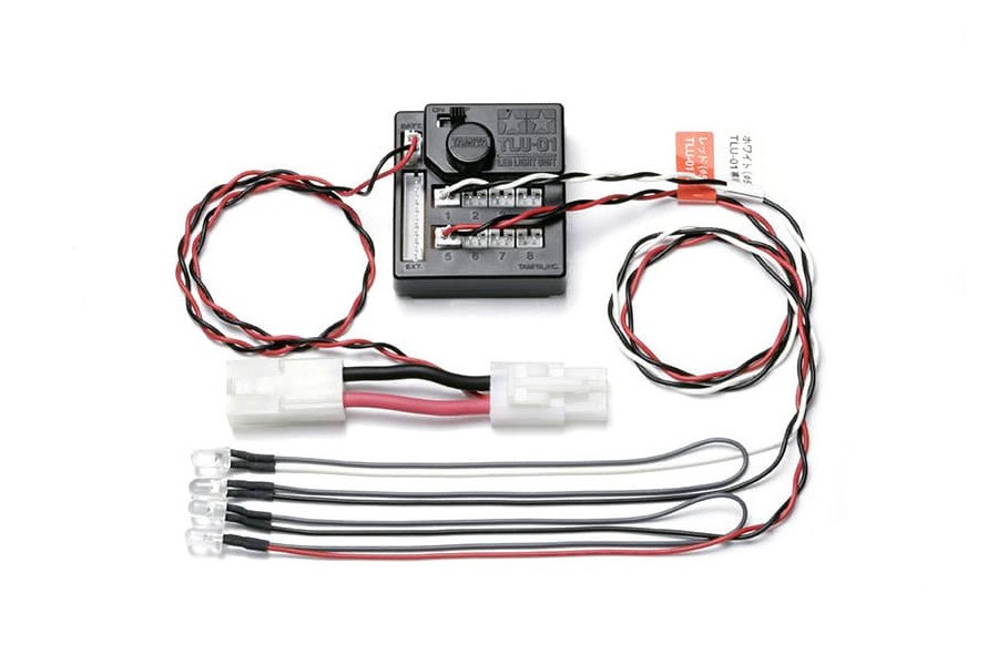 Для спецэффектов (стоп-сигналы, поворотники, мигающие фары и т.п.) дополнительно нужен блок Tamiya TLU-02. Подключив блок управления TLU-02 (TA-53937), вы сможете управлять двумя блоками TLU-01 и создавать дополнительные световые эффекты. Однако рекомендуется использовать дополнительные светодиоды белого, красного и оранжевого цветов (TA-53910, TA-53911, TA-53912).