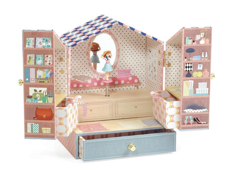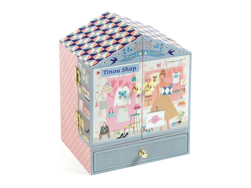 Музыкальная шкатулка «Магазинчик» от французского производителя Djeco (Джеко) — это красиво иллюстрированная музыкальная шкатулка в виде маленькой парижской лавки, в которой хранятся украшения и секреты маленькой принцессы. Поверните ручку, откройте коробку — увидите маленькую фигурку девушки и услышите мелодию «Волшебная флейта» Вольфганга Амадея Моцарта.