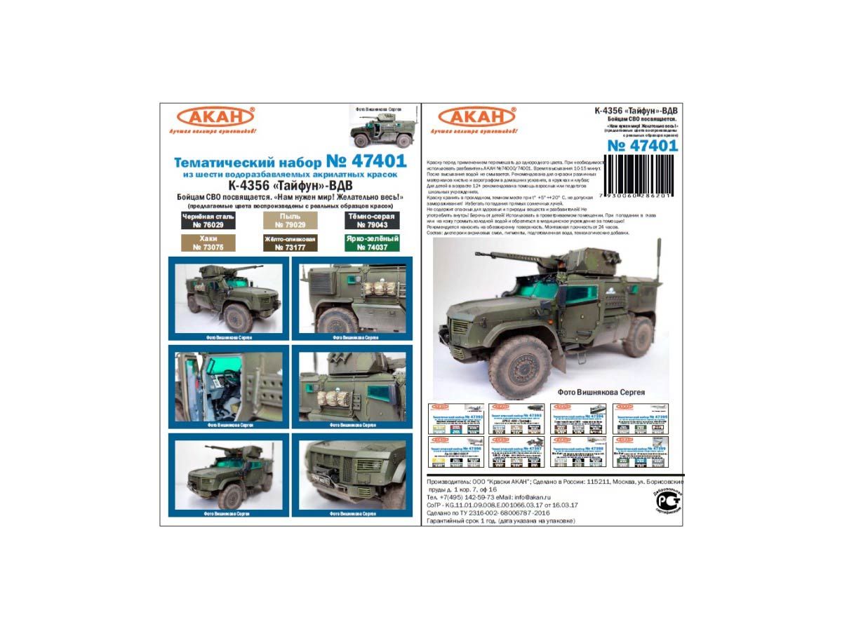 Тематический набор из 6 акрилатлатексных водоразбавляемых красок К-4356 Тайфун-ВДВ Современная армейская техника России на оригинальном разбавителе.Используется для окраски сборных моделей …