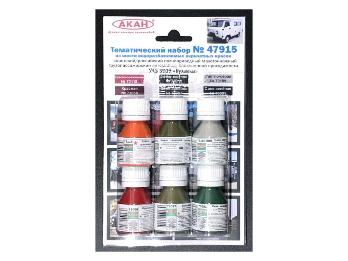 Тематический набор из 6 акрилатлатексных водоразбавляемых красок УАЗ 3909 "Буханка" на оригинальном разбавителе.