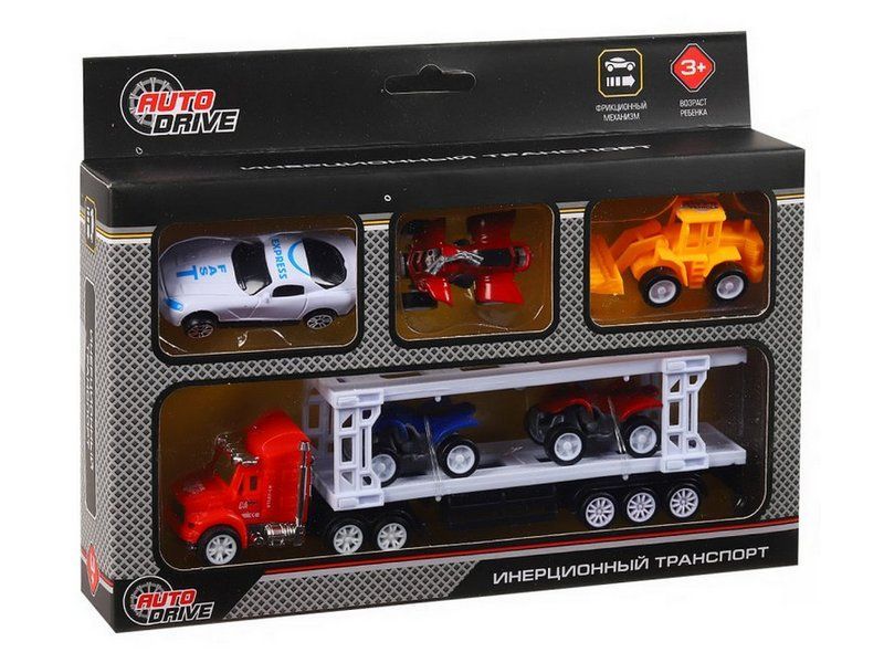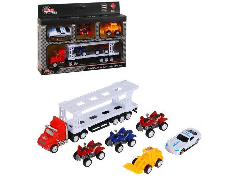 Набор "Транспорт" – это модели настоящих машин и спецтехники с высокой детализацией и качественной покраской всех элементов. В набор входит автовоз с фрикционным механизмом, а также пять моделек для перевозки: три квадроцикла, машинка и трактор.
