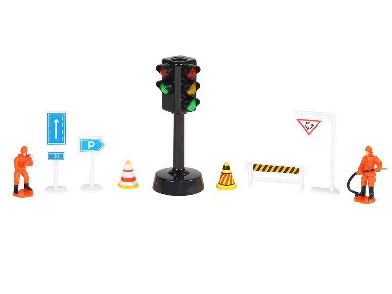 Благодаря тому, что в набор входят светофор со звуковыми и световыми эффектами, дорожные знаки и фигурки людей, ребенок сможет не просто играть, а также изучать правила дорожного движения.