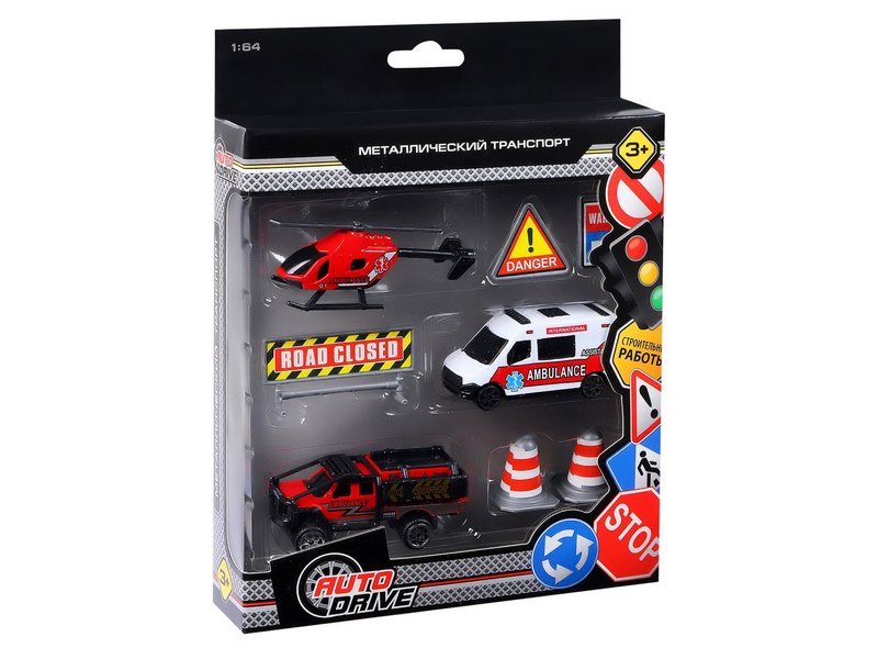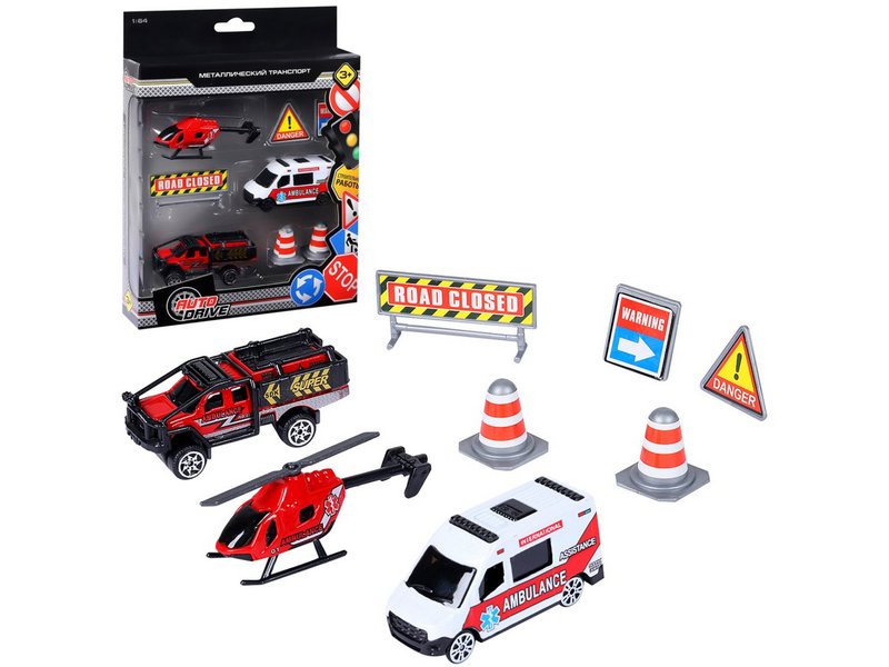 Тематический набор транспорта "Служба спасения" от AUTODRIVE. Металлический корпус делает игрушку крепкой и долговечной. В набор входит несколько дорожных знаков, дорожные конусы. Широкая линейка позволит реализовать любые увлекательные сюжеты, стимулируя фантазию и воображение. Разнообразные и интересные машинки из серии "Спецслужбы" подойдут для большинства игрушечных парковок, треков и гаражей.