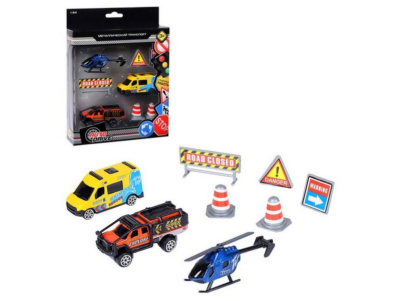 Набор металлических машинок AUTODRIVE JB0403983, Городская техника 3шт с дорожными знаками