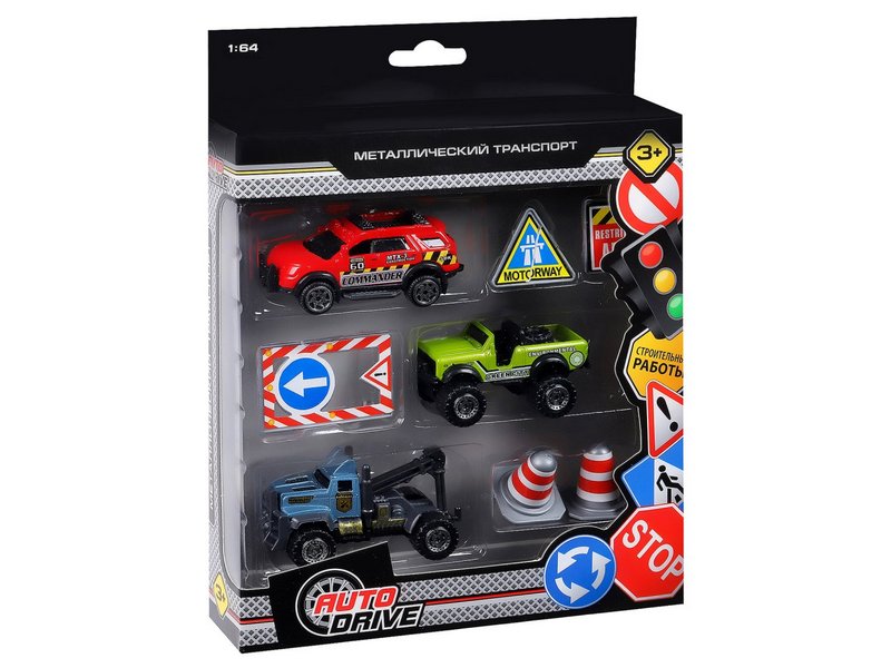 Набор металлических машинок AUTODRIVE JB0403984, Городская техника 3шт с дорожными знаками