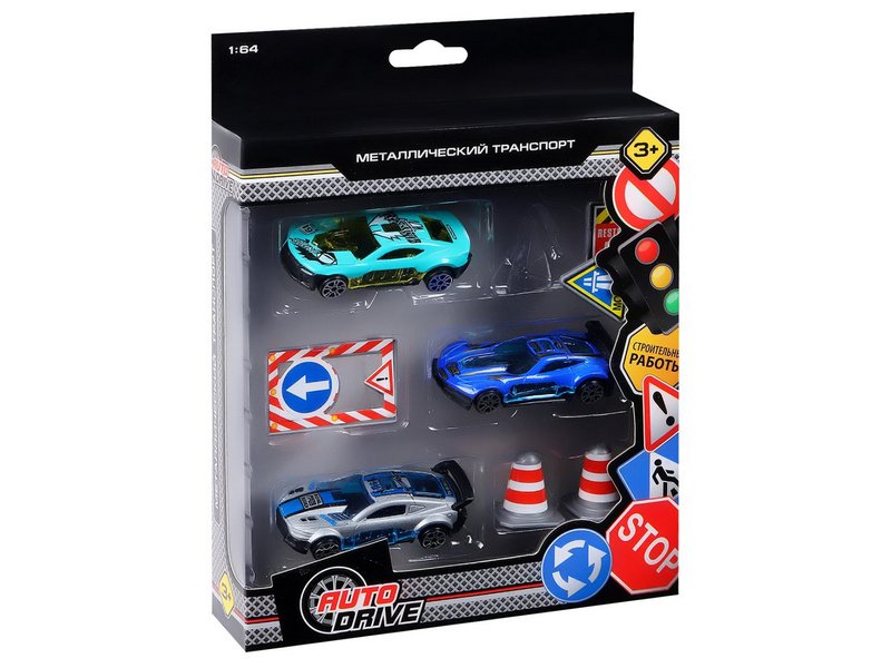 Набор металлических машинок AUTODRIVE JB0403989, Гоночные машины 3шт с дор. знаками в/к 23*17,5*4см