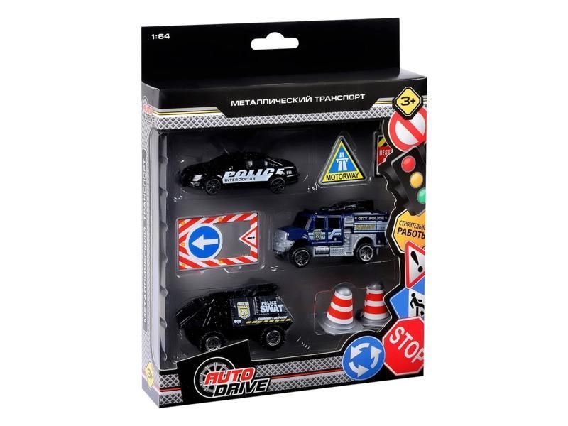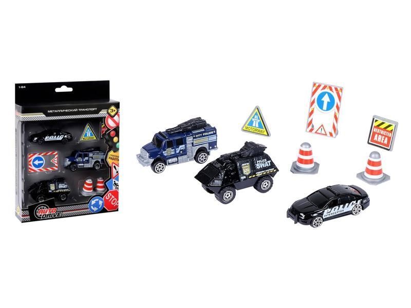 Набор металлических машинок AUTODRIVE Полицейская техника 3шт (машина, джип, бтр), дорожные знаки