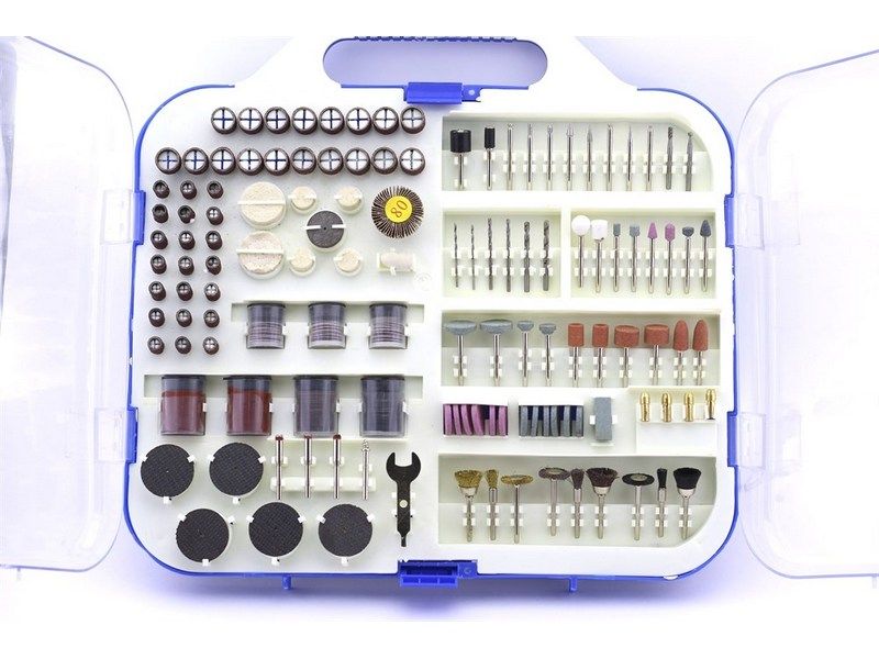 Большой комплект насадок для основных работ по дереву и металлу. Всего 249 предметов. Комплект поставки: