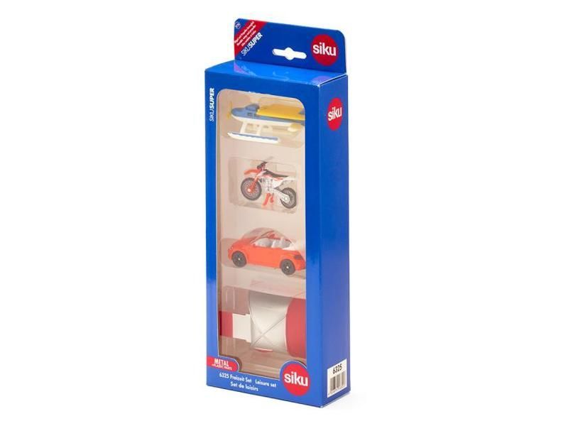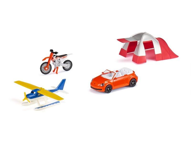На большом озере всегда что-то происходит. Оранжевый кабриолет припаркован на берегу озера, рядом с большим навесом. Взлетает гидросамолет, а из-за угла рычит мотокроссовый мотоцикл. Набор для отдыха Siku создает ваш собственный игровой мир. В комплект входят гидросамолет со складывающимися крыльями, кросс-мотоцикл KTM с шинами с глубоким протектором, подставкой и подвижным рулем, а также кабриолет Beetle со спортивными ободами и прорезиненными шинами.