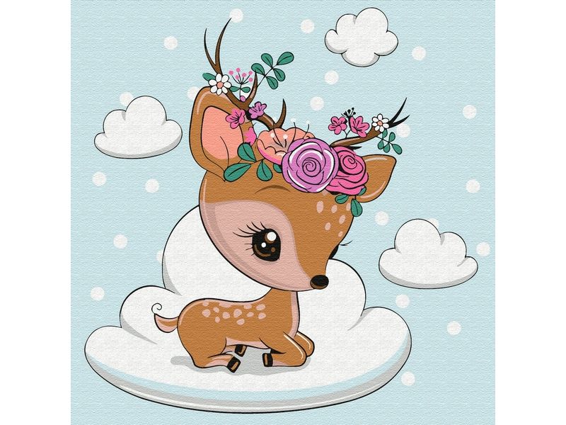 С помощью набора для творчества можно нарисовать маленького олененка с цветами, сидящего на облаке. Для такого творчества не требуются специальные художественные навыки. Нужно лишь следовать инструкции и время от времени сверяться с цветовой схемой рисунка.