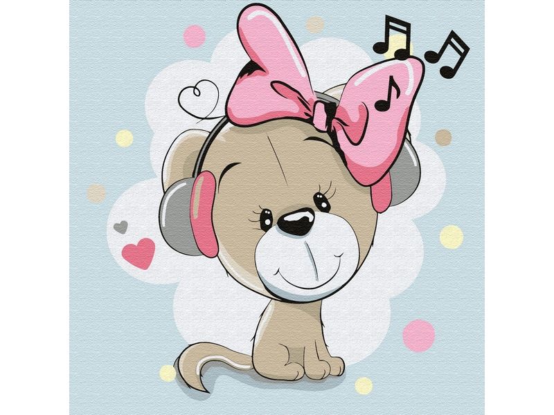 С помощью набора для творчества можно нарисовать щенка-музыканта с огромным, розовым бантом в наушниках. Для такого творчества не требуются специальные художественные навыки. Нужно лишь следовать инструкции и время от времени сверяться с цветовой схемой рисунка.