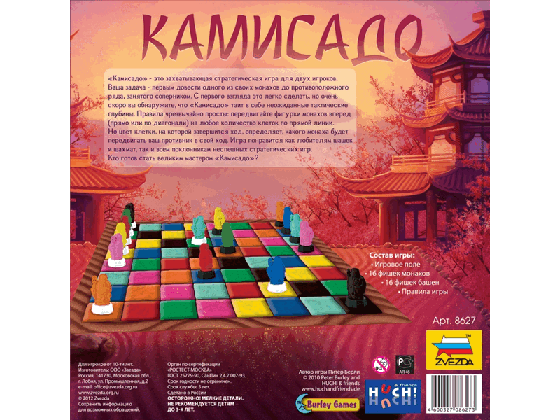 «Камисадо» - это захватывающая стратегическая настольная игра для двух игроков. Ваша задача - первым довести одного из своих монахов до противоположного ряда, занятого соперником. С первого взгляда это легко сделать, но очень скоро вы обнаружите, что «Камисадо» таит в себе неожиданные тактические глубины. Правила чрезвычайно просты: передвигайте фигурки монахов вперед (прямо или по диагонали) на любое количество клеток по прямой линии. Но цвет клетки, на которой завершится ход, определяет, какого монаха будет передвигать ваш противник в свой ход. Игра понравится как любителям шашек и шахмат, так и всем поклонникам неспешных стратегических игр. Кто готов стать великим мастером «Камисадо»?