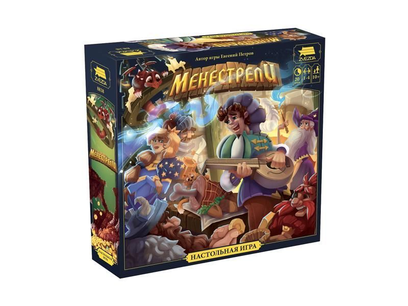 «Менестрели» – семейная игра для 1-4 участников. Помимо базовых правил, игра предлагает попробовать свои силы в режиме «Квесты» и «Герои». Завоевать сердца публики можно и в одиночку, используя правила «Соло-режима».