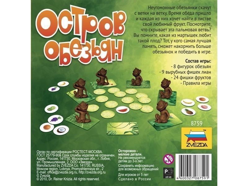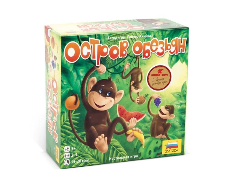 Быстрая веселая семейная игра, развивающая память. Игроки должны накормить веселых обезьянок. Каждая из них любит только определенный вид фруктов. При этом они совершенно неотличимы одна от другой. Игрокам необходимо запомнить, что любит каждая из обезьянок. Тот, кто справиться с этим лучше, накормит больше мартышек и победит в игре.