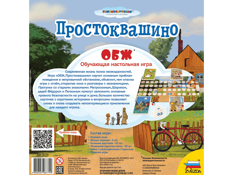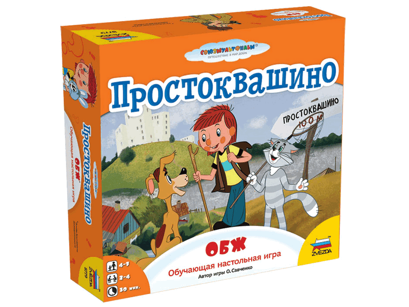 Детям необходимы знания по основам безопасности жизнедеятельности. Настольная Игра «Простоквашино. ОБЖ» познакомит с базовыми приёмами поведения в непривычных обстоятельствах, объяснит опасность игр с огнём и открытыми окнами. Дети запомнят свои имена и адреса, телефоны родителей и служб спасения, познакомятся с основами гигиены и социального взаимодействия. Что такое ОБЖ? Загадочная аббревиатура иногда ставит взрослых в тупик, но нынешние дети знают её расшифровку с детского сада. Основы безопасности жизнедеятельности должны быть знакомы каждому с самого раннего детства. А чтобы столь важные знания запоминались с удовольствием – мы предлагаем поучаствовать в забавной викторине. С её помощью дети узнают как себя вести в непредвиденных ситуациях, усвоят полные имена родителей и адрес своего проживания, запомнят телефоны родителей и спецслужб. Надо ли разговаривать с удивительно ласковым незнакомцем на улице, опасны ли открытые окна, что делать в случае пожара или если ты оказался в толпе? На эти (и не только) вопросы найдутся ответы в новой игре ОБЖ. Смелей бросайте кубик (цвет выпавшей грани определит категорию вопроса), читайте вопрос и 3 возможные варианта ответа и выбирайте. Победит игрок, чья фишка первой пересечёт деревню Простоквашино.