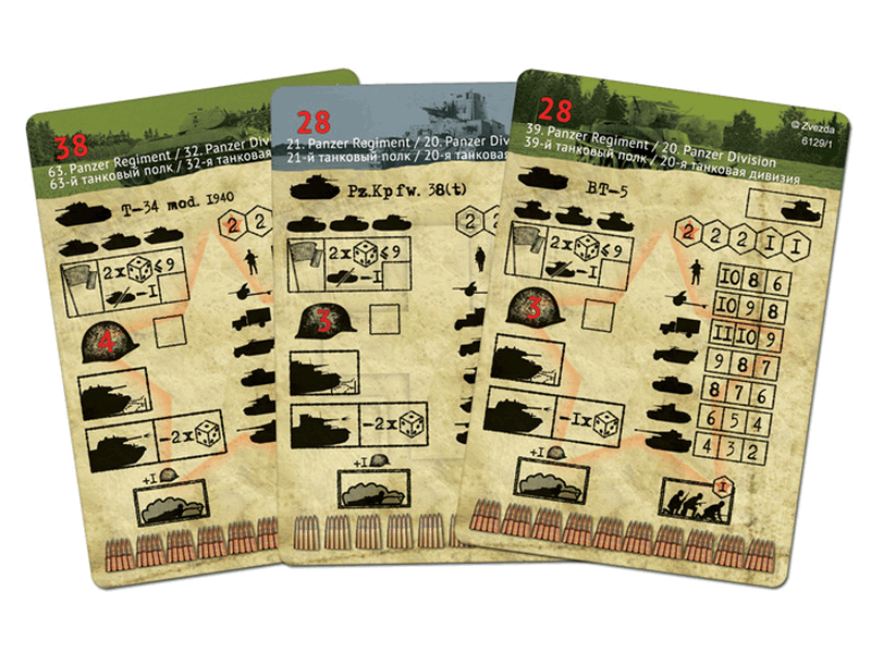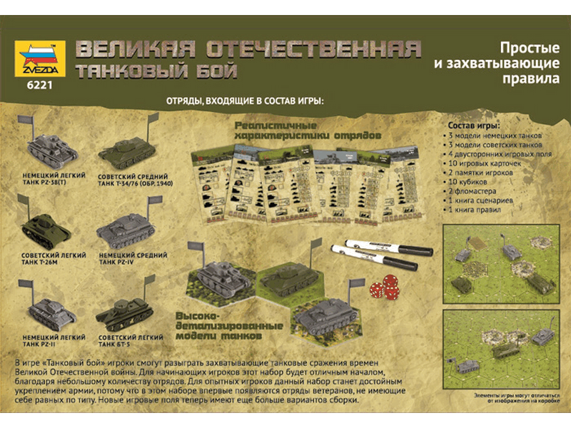 Высокодетализированные модели в составе: 3-х моделей немецких танков и 3-х моделей советских танков, 4 двусторонних игровых поля, 10 игровых карточек, 2 памятки игроков, 10 кубиков, 2 фломастера, книга сценариев и книга правил.