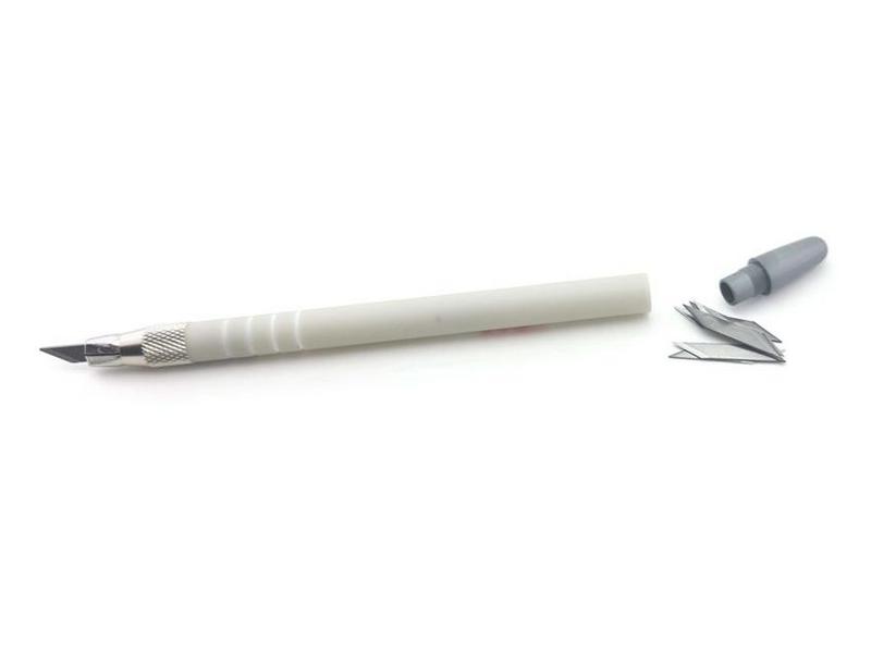 Нож с цанговым зажимом напоминает ручку для письма, миниатюрное лезвие отлично подходит для вырезания трафаретов.Лезвия можно хранить в ручке ножа.