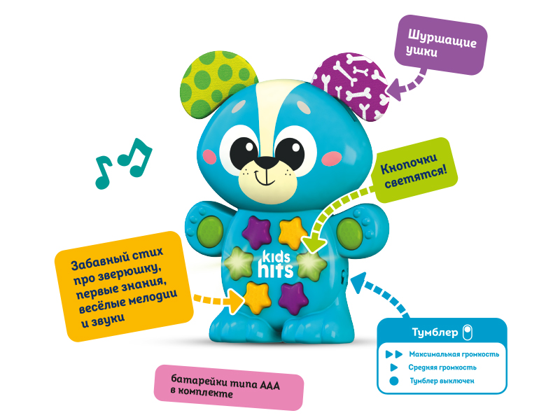 С помощью тумблера громкости родители могут выбирать между максимальной и средней громкостью, а также полностью отключить игрушку. Это позволяет адаптировать звучание под любые условия, создавая комфортную атмосферу для обучения и развлечения. Музыкальный щенок - это не только игрушка, но и ваш верный помощник в познании удивительного мира знаний.