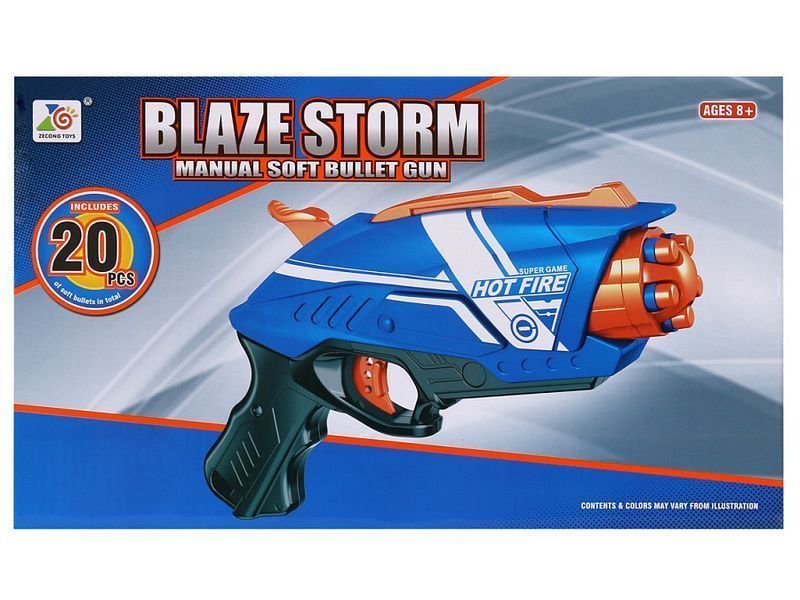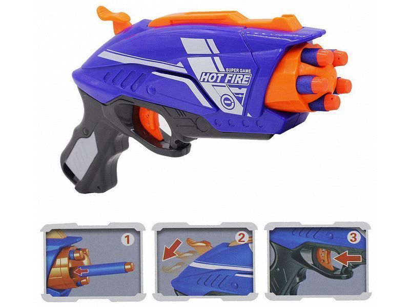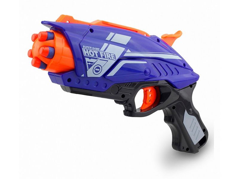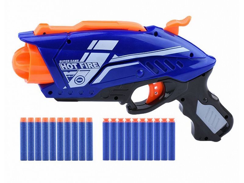 Пистолет имеет приличный размер, выполнен из пластика, укомплектован 20 зарядами, и имеет яркий необычный дизайн. Особенностью этого детского оружия является использование мягкой пены для пуль, безопасной маленьким детям.
