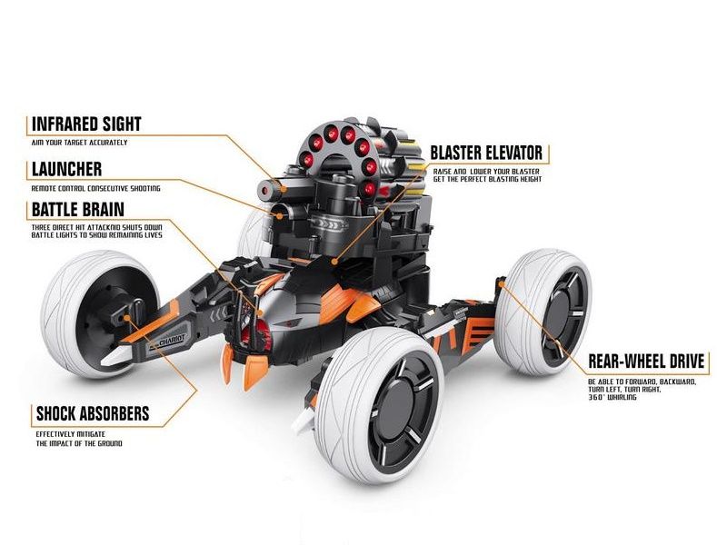 Робот стреляет пластиковыми ракетами, расположенными в специальной обойме с автоматической зарядкой боевой пушки. На роботе расположена броня, которая отваливается при попадании в нее, а после трех успешных попаданий в робота, он выходит из строя. Для того чтобы вновь вернуться в игру необходимо перезапустить боевую машину. На моделе установлена светодиодная подсветка с индикацией вашей жизни, которая проинформирует вас сколько попаданий осталось до отключения вашего робота. Заднеприводные колеса позволяют двигаться во всех направлениях и делать повороты на 360°. Для более плавной езды робот оборудован амортизаторами. А для еще большей реалистичности игрового процесса, робот оснащен звуковыми эффектами.