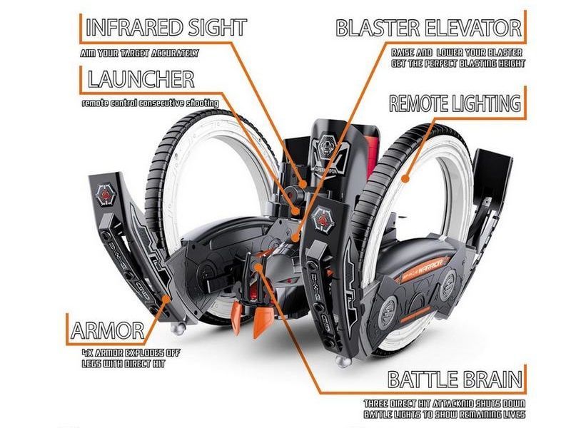 Робот стреляет пластиковыми дисками, расположенными в специальной обойме с автоматической зарядкой боевой пушки. На роботе расположена броня, которая отваливается при попадании в нее, а после трех успешных попаданий в робота, он выходит из строя. Для того чтобы вновь вернуться в игру необходимо перезапустить боевую машину. На моделе установлена светодиодная подсветка с индикацией вашей жизни, которая проинформирует вас сколько попаданий осталось до отключения вашего робота. Заднеприводные колеса позволяют двигаться во всех направлениях и делать повороты на 360°. Для более плавной езды робот оборудован амортизаторами. А для еще большей реалистичности игрового процесса, робот оснащен звуковыми эффектами.