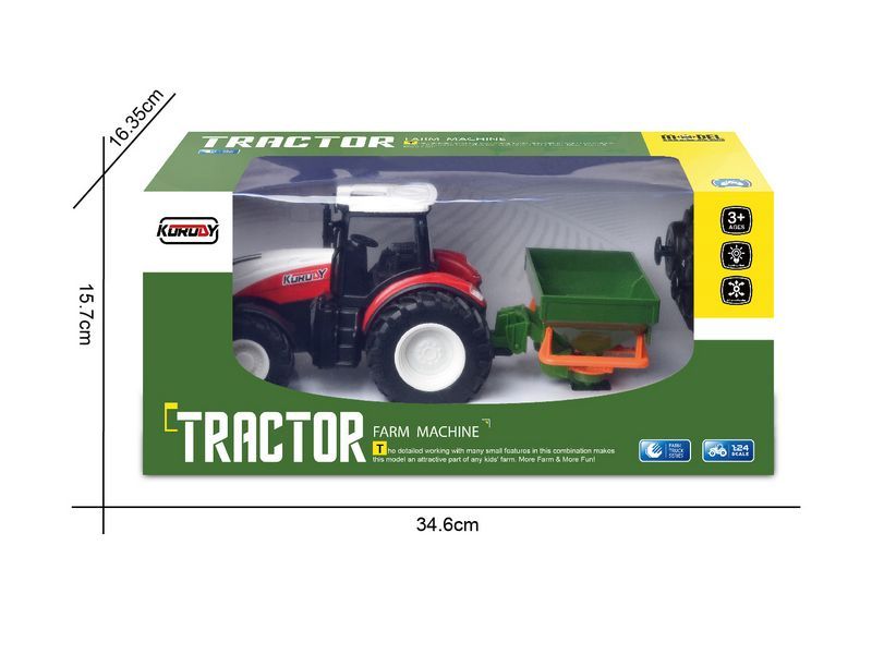 Трактор двигается вперед, назад, способен повернуть налево и направо, включить/выключить свет, а также включается демонстрационный режим. К тракторам Korody легко прицепляется навесное оборудование, чтобы показать детям, как возделываются поля и выращиваются сельскохозяйственные продукты. Трактор имеет в комплекте поливалка. Поливалка легко снимается и может перемещаться самостоятельно.