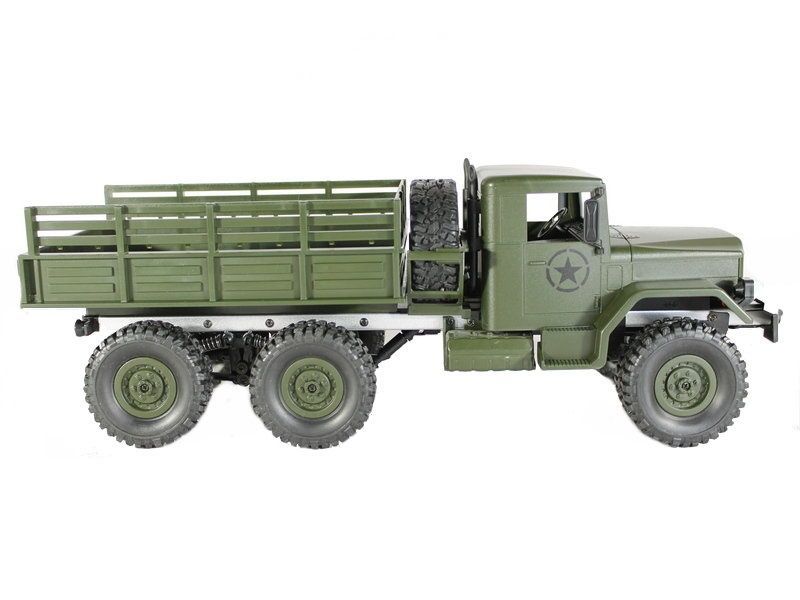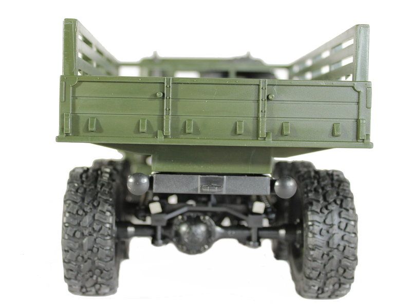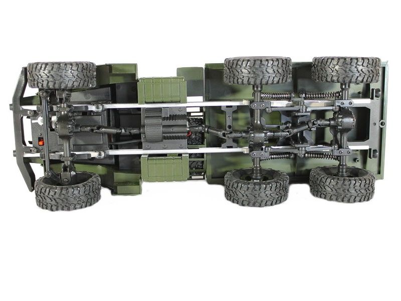 Радиоуправляемая модель военного грузовика масштаба 1:16 с постоянным полным приводом 6x6. Вместительный кузов позволяет нагружать его различными грузами. Износостойкие объёмные шины и высокий дорожный просвет обеспечивают прекрасное сцепление с различным видам поверхностей: песок, камни, горная дорога шоссе. Даже рельефы с резкими перепадами и неровностями (до 45 градусов) модель способна преодолевать без проблем. А включенные передние фары позволяют эксплуатировать модель в темное время суток.