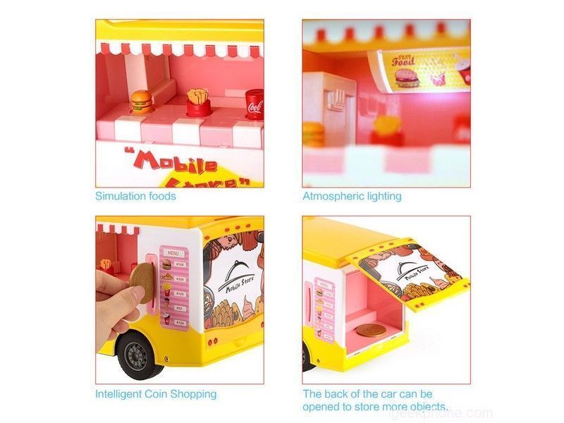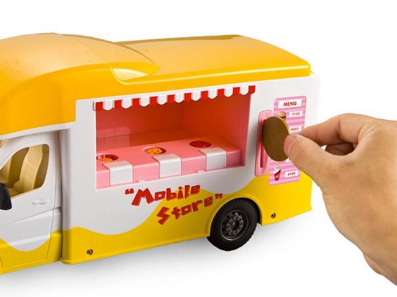 Фургон Магазин на колесах открывается дистанционно и превращается в настоящий магазин самообслуживания. Опустив монетку в монетоприемник можно выбрать себе понравившийся продукт. Монетка не исчезнет безвозвратно, ее после игры можно забрать, открыв заднюю дверь. Под потолком фургона Магазин на колесах установлена подсветка, которая активируется кнопкой на пульте.