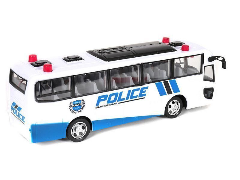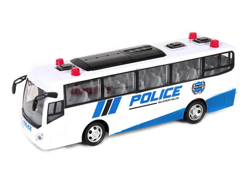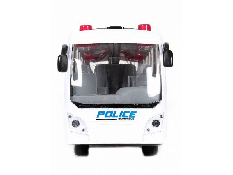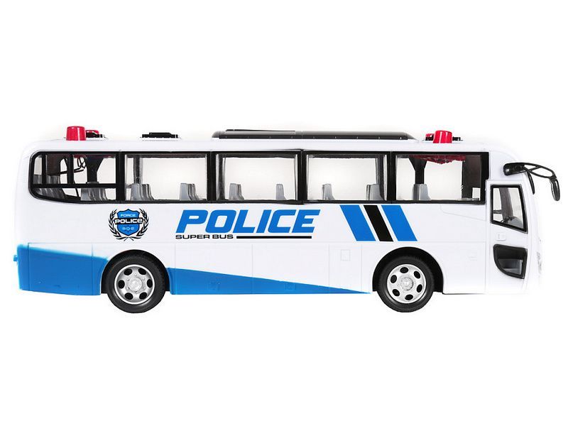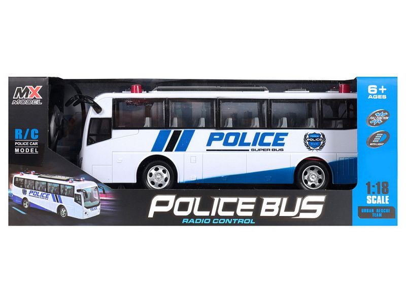 Радиоуправляемый автобус c расцветкой Полиция. Модель выполнена в масштабе 1:18 и двигается во всех направлениях: вперед, назад, повороты вправо и влево. Сквозь окна, сделанные из пластмассы, можно разглядеть салон, а также приборную панель. Расцветка в виде полицейской машины и мигалки на крыше сделают игру более интересной.