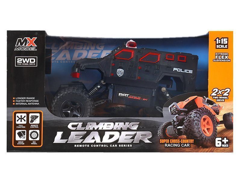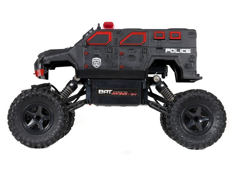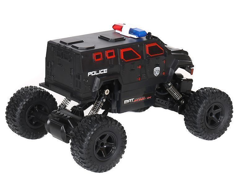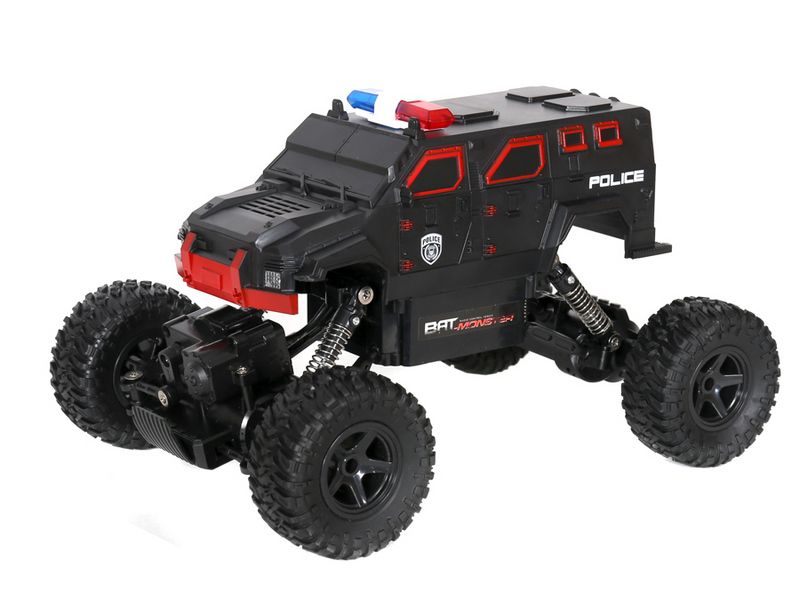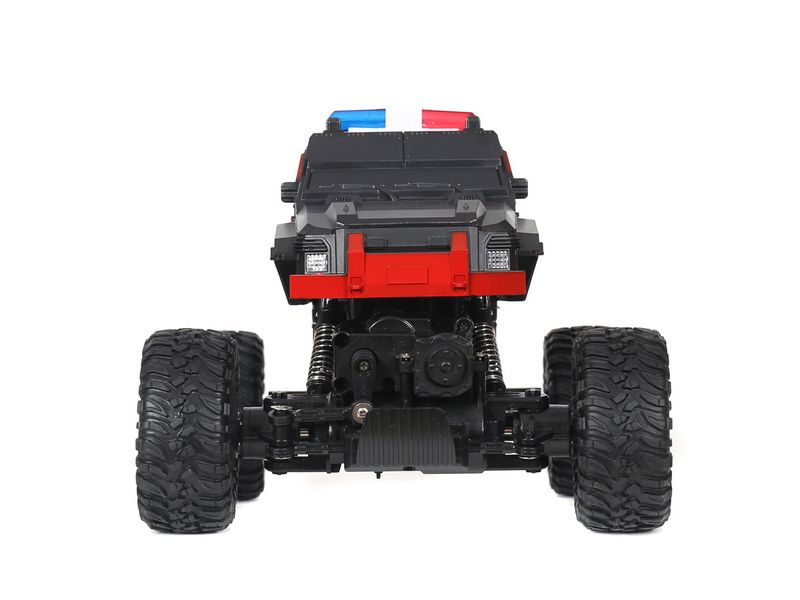 Радиоуправляемый краулер c приводом 2x2 и большими колесами способен покорять бездорожье. Модель выполнена в масштабе 1:15. Способна двигаться во всех направлениях: вперед, назад, повороты вправо и влево. Расцветка в виде полицейской машины и мигалки на крыше сделают игру более интересной.